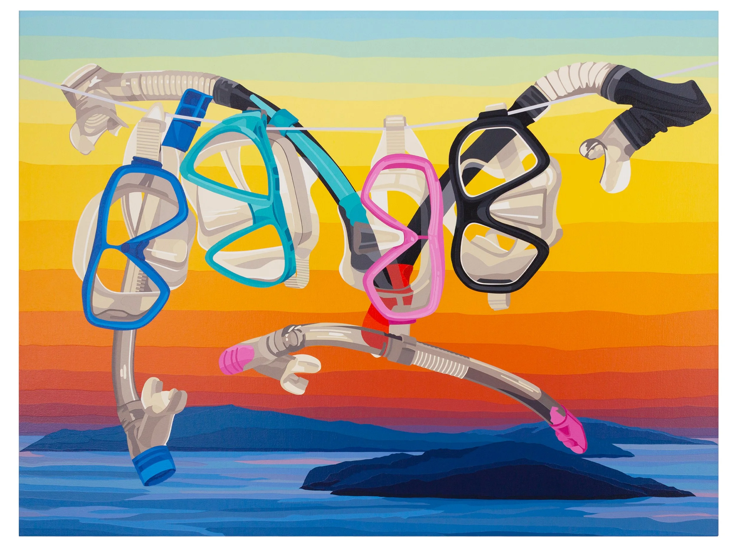 ‘Sun Dazed’, my fourth solo exhibition with Maddox Gallery, marks a gentle evolution in this visual language. Where earlier works used figures to articulate narrative and human presence, these paintings allow that sense of life to surface more obliquely. Faces seem to suggest themselves within architectural rhythms. Objects incline toward one another in silent exchange. An inflatable crocodile and scattered beach balls carry the exuberance of children lingering by the pool’s edge. Chairs gather as if mid-conversation over a Negroni in late afternoon light. Snorkels hang side by side, almost canoodling as they dry in the sun.